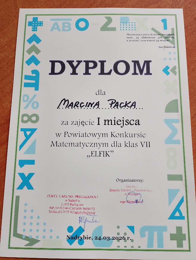 W dniu 24.03.2026 r. w Zespole  Szkolno-Przedszkolnym w Nadrybiu odbył się Powiatowy Konkurs Matematyczny dla klas VII “Elfik”. Naszą szkołę  reprezentowali uczniowie klasy 7A Lena Sprawka i Marcin Pacek. W konkursie uczestniczyli przedstawiciele  dziewięciu szkół podstawowych  powiatu łęczyńskiego. Uczniowie  w czasie  90 minut mieli do rozwiązania 20 zadań o podwyższonym stopniu trudności. Były to zadania zamknięte, z luką, otwarte i na uzasadnienie.